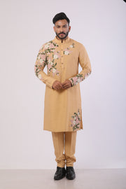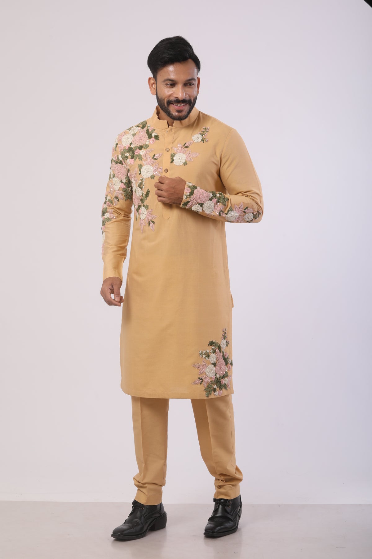 Redefine sophistication with this Beige Katan Silk Embroidered Kurta Set, designed for the modern man who values timeless style and refined craftsmanship. The smooth texture of premium Katan silk offers a luxurious sheen, while the intricate embroidery adds a subtle touch of grandeur. The Mandarin collar gives a structured and elegant look, making this ensemble perfect for festive occasions, formal events, or cultural gatherings. Paired with straight-fit pants, it ensures both comfort and style in every step.