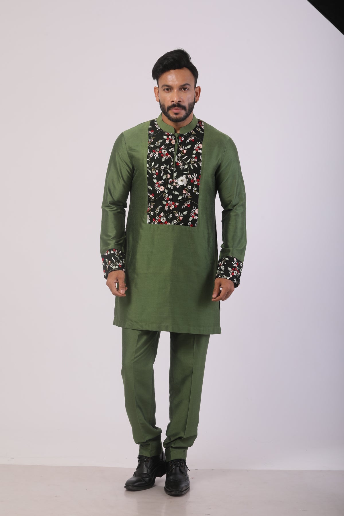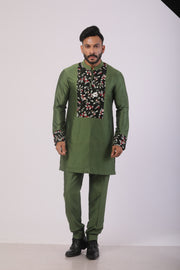 Refined, elegant, and timeless — this Olive Green Kurta Set captures the essence of modern sophistication rooted in tradition. Tailored from premium Katan silk, the set offers a luxurious sheen and smooth texture. The Mandarin collar adds a regal edge, while the fine embroidery lends intricate detailing that enhances its festive appeal. Paired with straight-fit pants, this outfit is perfect for celebrations, formal gatherings, or evening functions where effortless class matters most.