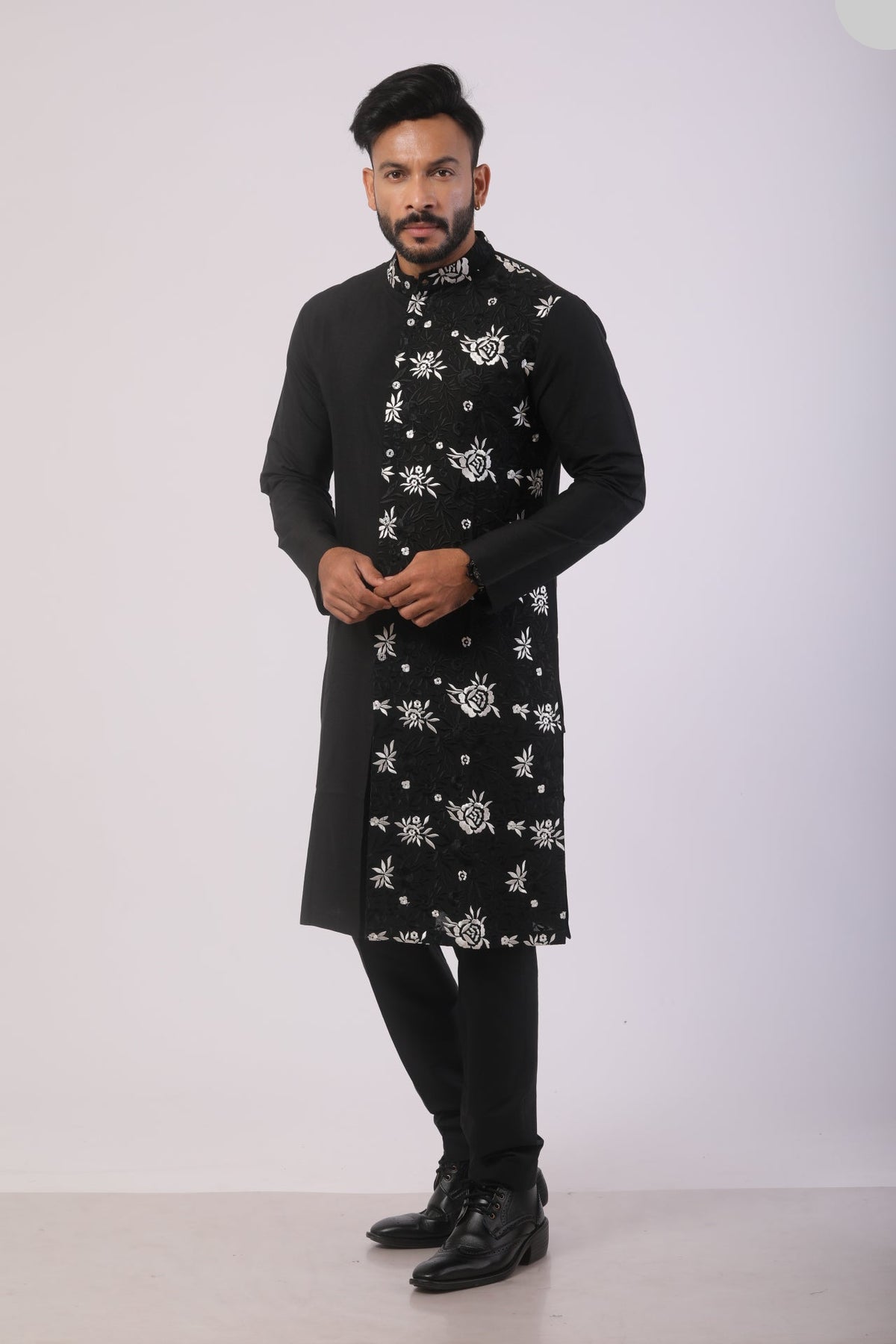 Paired with a straight-fit pant in matching Katan Silk, the set ensures comfort, durability, and an effortlessly classy appeal. Perfect for weddings, formal celebrations, festive gatherings, and high-end traditional events.
