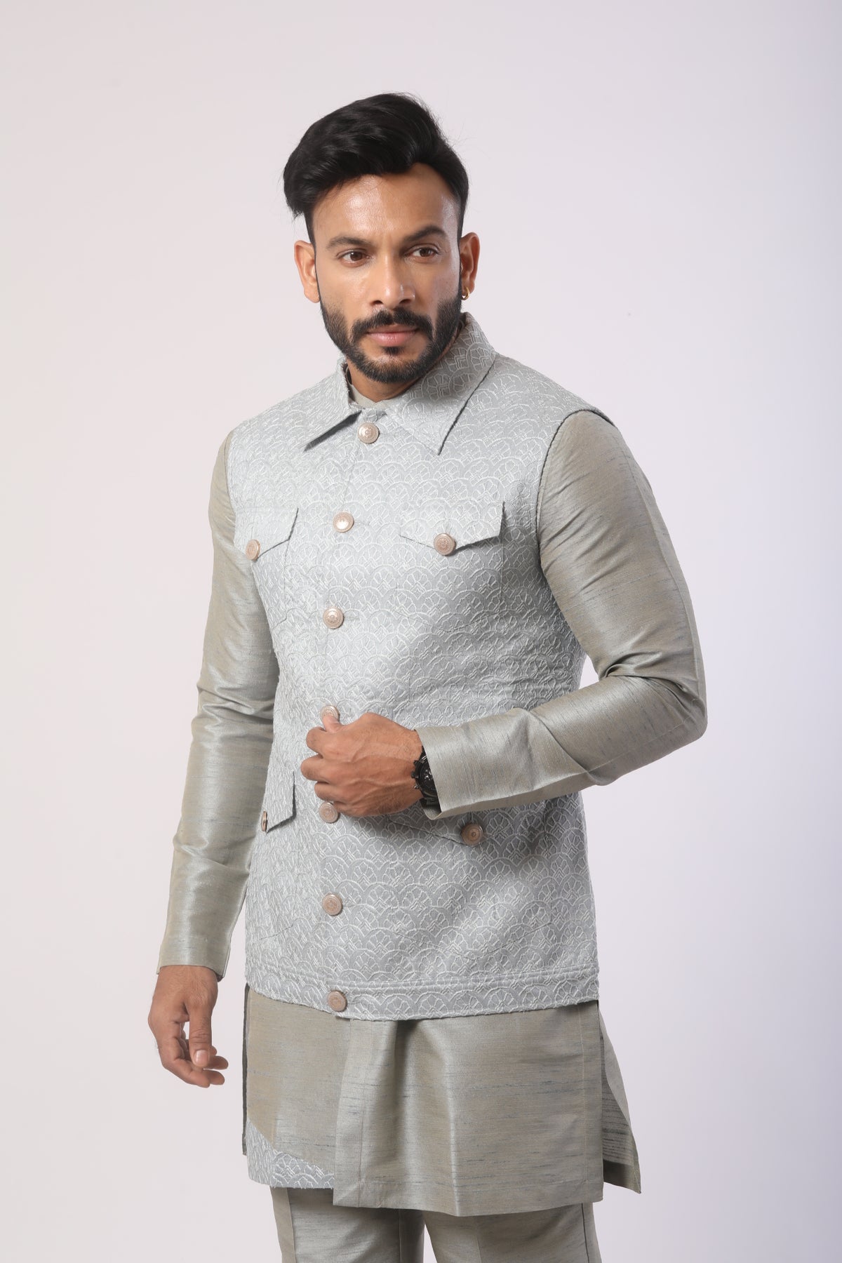 This Grey & Steel Grey Seltos Kurta Set is designed to elevate your festive wardrobe with understated luxury. The embroidered Nehru Jacket adds a structured, regal touch, while the kurta offers clean lines with a mandarin collar for timeless sophistication. Crafted to perfection, this ensemble provides both comfort and elegance, making it an excellent choice for weddings, engagements, and formal celebrations.