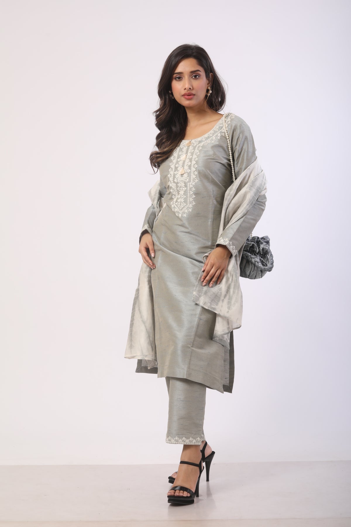 Metallic Grey Seltose Kurti Set with Chanderi Dupatta
