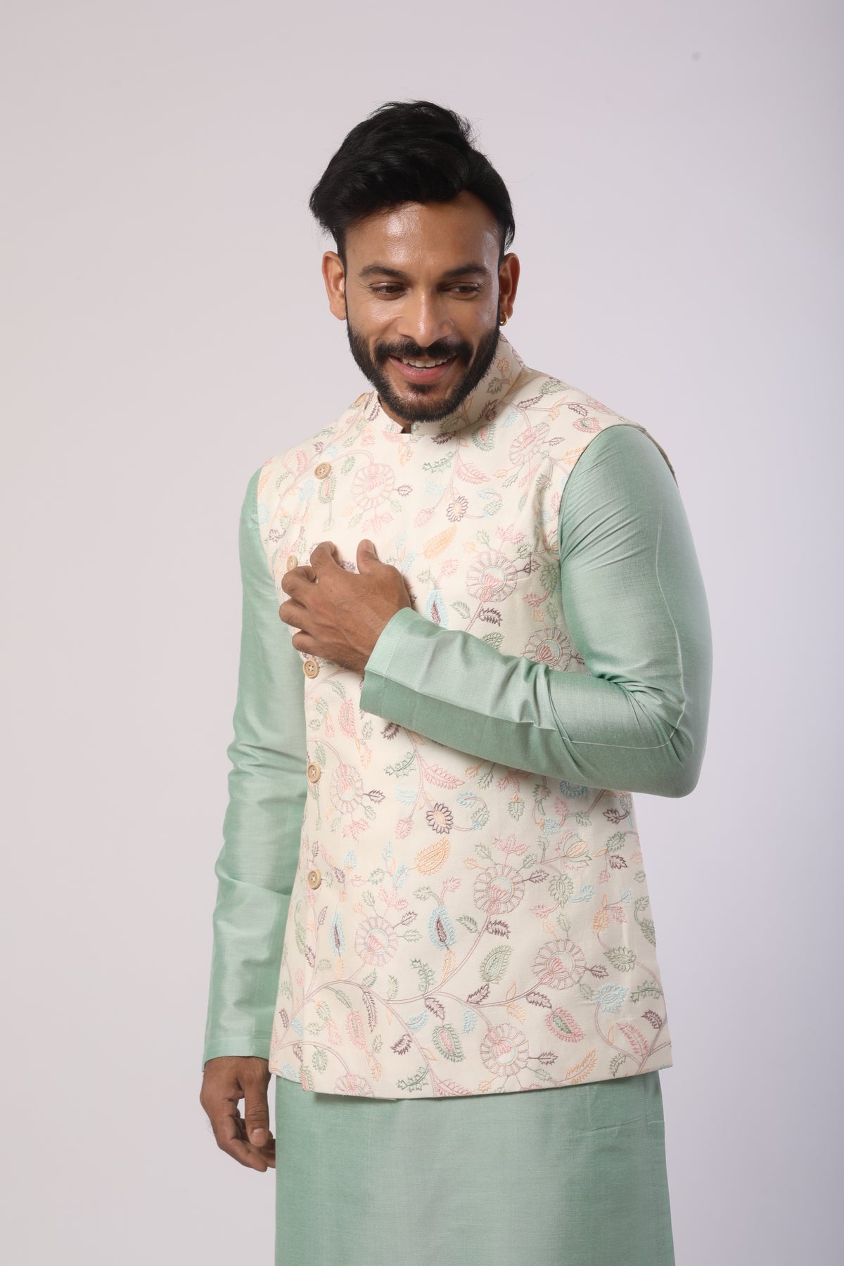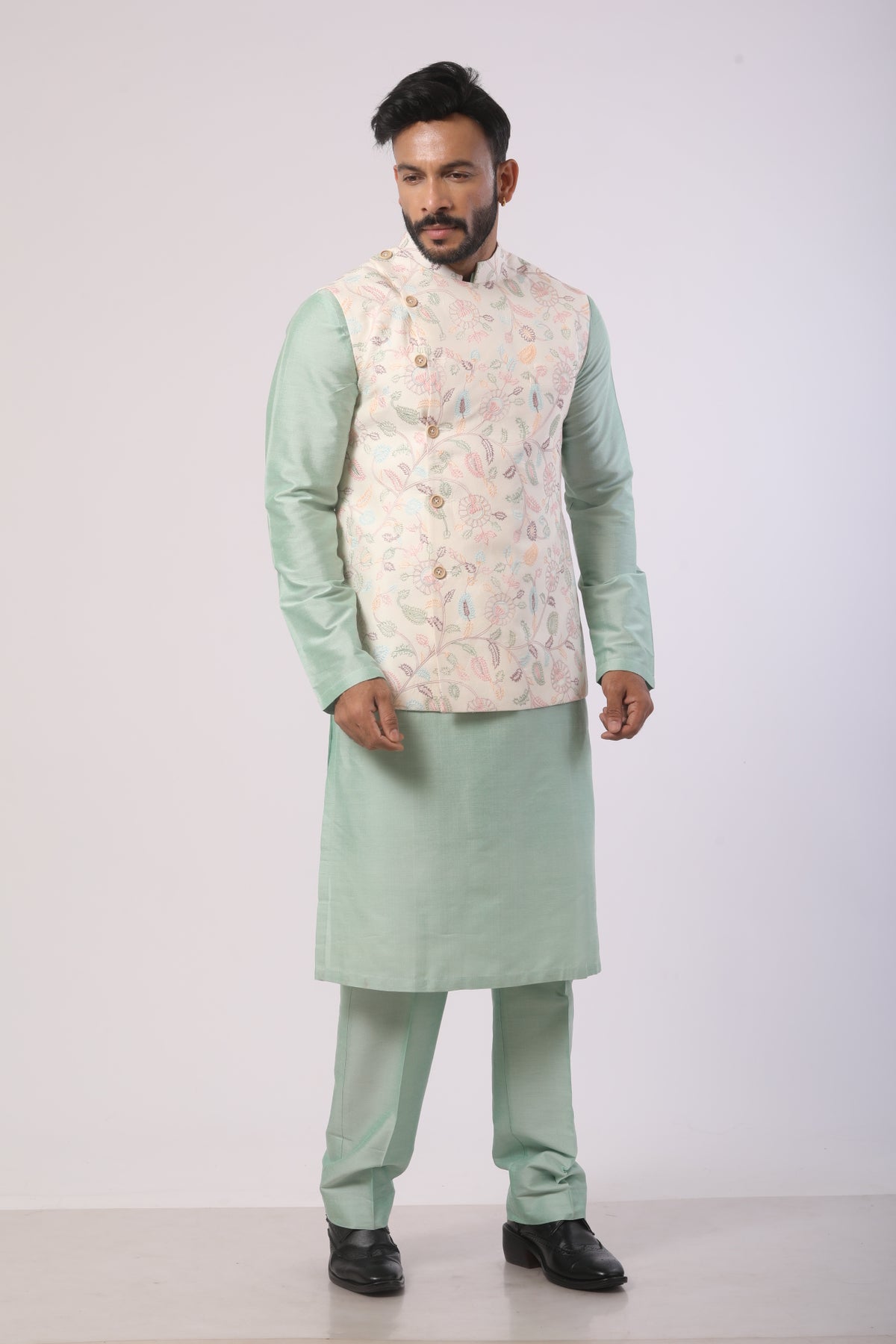Shop premium Katan Silk Aqua Marine Kurta Pant with Off-White Bandhgala Jacket. Elegant embroidered men’s ethnic wear for weddings & festive occasions.