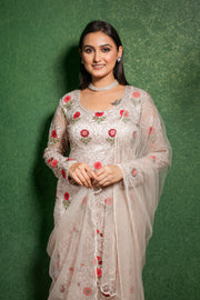 Step into timeless elegance with the Affifa Beige Net Kurta Sharara Set. Crafted in airy net fabric, this three-piece ensemble shines with intricate Ari embroidery, glistening stones, sequins, and fine cutdana work that catches every ray of light. The round-neck kurta pairs beautifully with a flowy sharara and a delicately embroidered dupatta, creating a look that’s both regal and comfortable—ideal for festive evenings, wedding functions, or any special occasion where you want to glow with understated glamour.