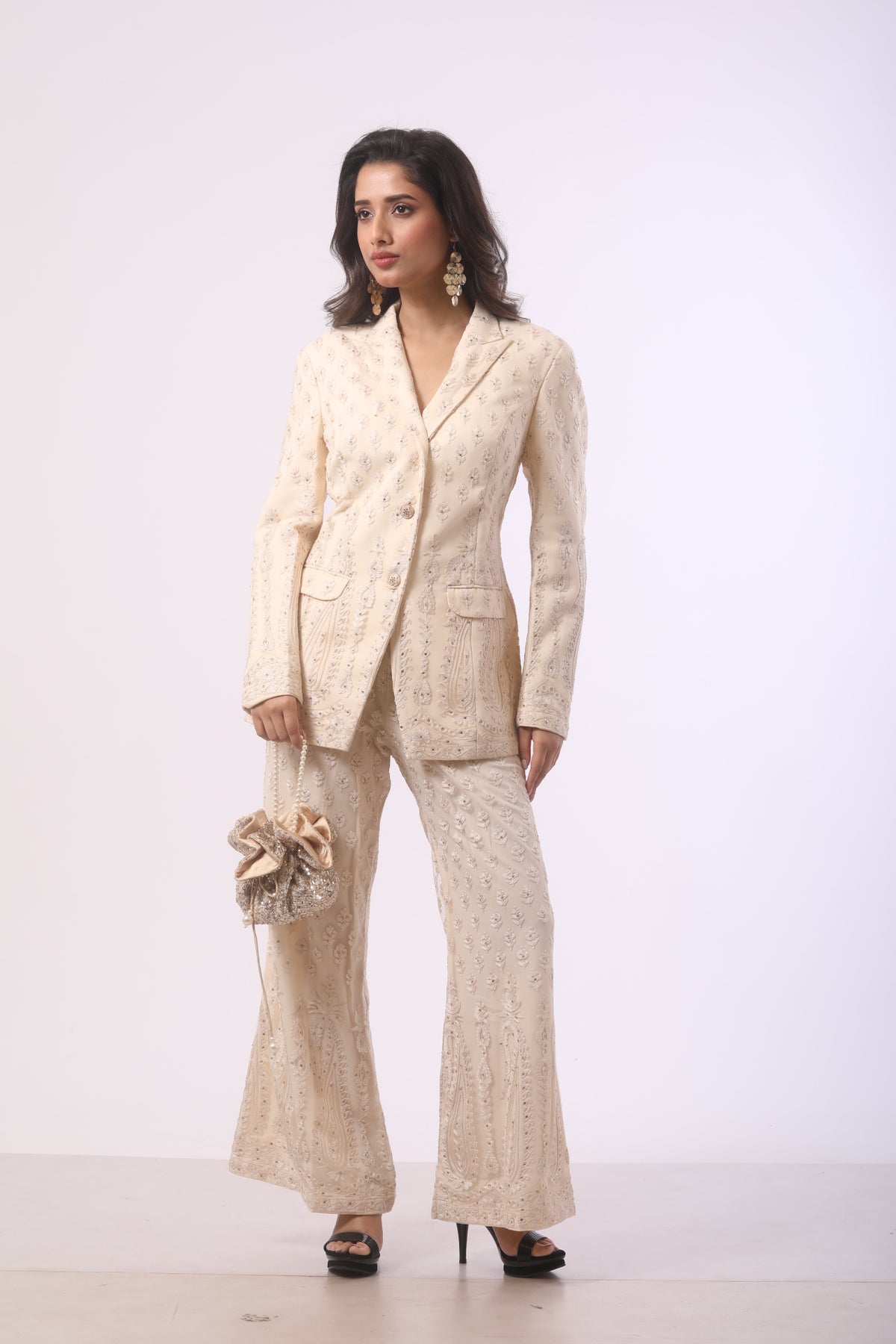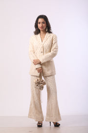 The structured notch collar jacket brings a touch of sophistication, while the bell bottom pants give it a flattering, contemporary finish. This statement set is designed for those who love timeless elegance with a modern twist.