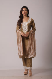 Affifa brings you a Mehndi Green Kurta Set with dori work, full sleeves & round neck. Paired with Palazzo Pant & Chanderi Dupatta for your festive vibes.