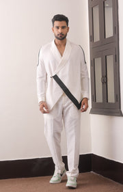 Upgrade your wardrobe with this White & Black Silk Katan Men’s Co-Ord Set, crafted for men who value refined style with a modern edge. The luxurious Silk Katan fabric offers a smooth finish and a premium feel, making this set perfect for statement-making occasions.